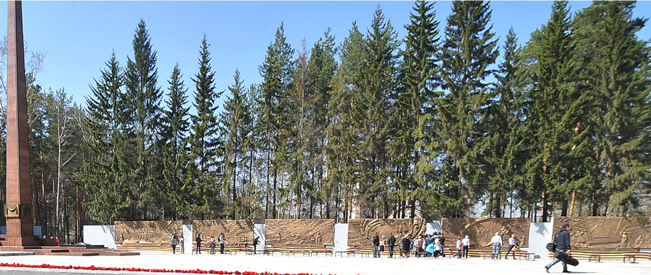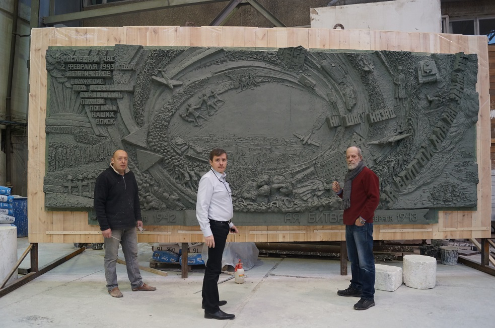 Авторы С.Титлинов, А Медведев и соавтор А.Чернышев перед барельефом Сталинградская битва