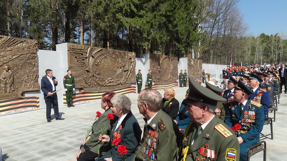 открытие Широкореченского мемориала к 75-летию Победы. Выступление автора С.Титлинова перед ветеранами с рассказом о содержании барельефов