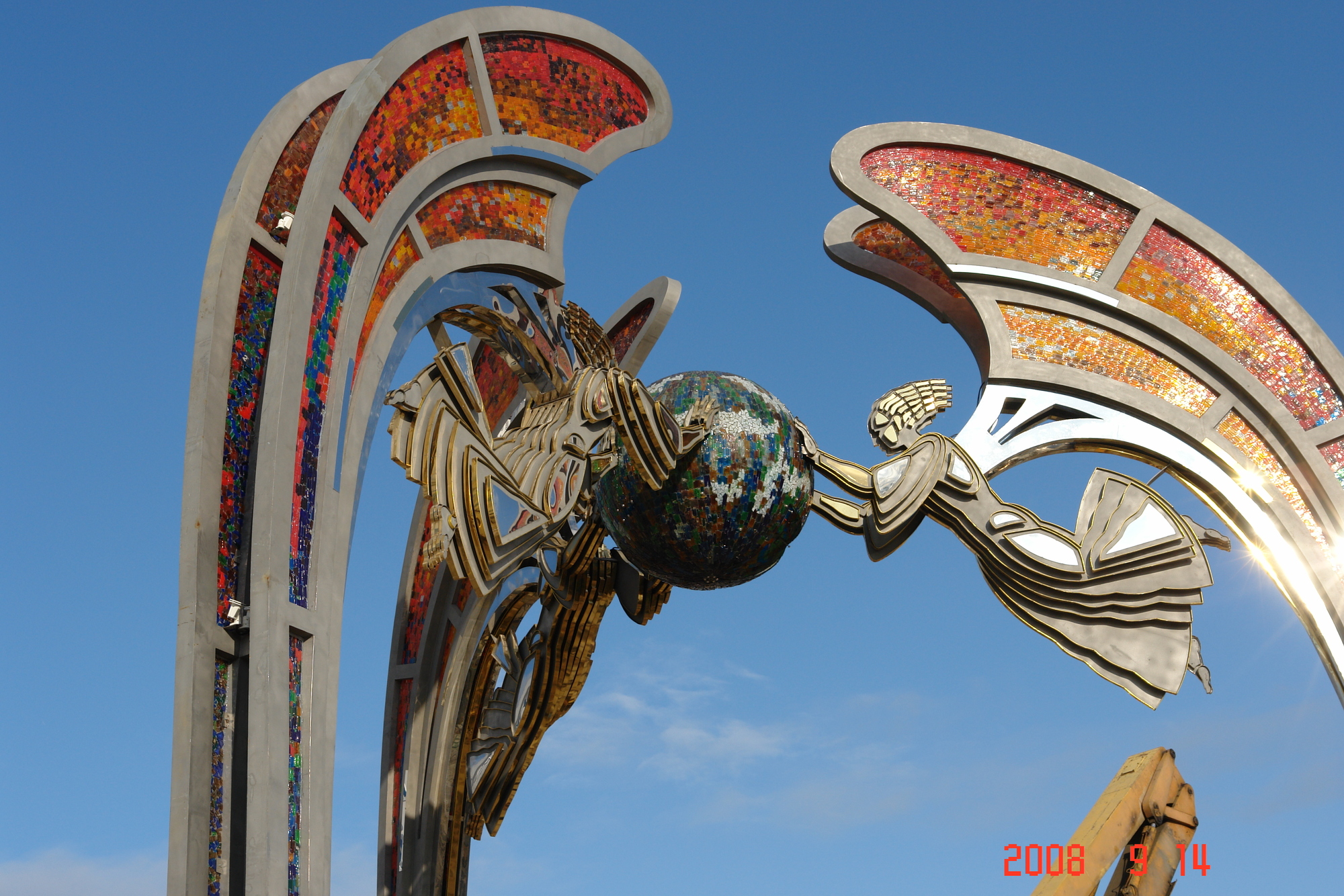 Фонтан "Земля" создан и установлен в г. Салехард перед зданием Правительства ЯНАО специалистами Творческого объединения "Екатеринбургский художественный фонд". Первое авторское название фонтана "Ангелы": они то ли берегут Землю, то ли играют ею. Название не было утверждено властными структурами. Навершие фонтана создано из нержавеющей стали и стеклополимерного композита - всепогодного витража, который выпускал Екатеринбургский художественный фонд в 2002 - 2008 г.г.